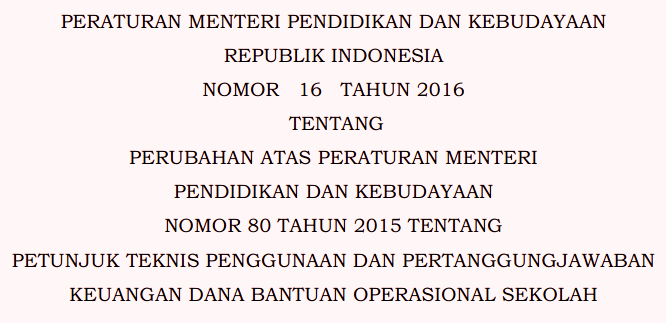 Berdasarkan Pasal 1 Permendikbud No 16 Tahun 2016 dinyatakan bahwa Mengubah Lampiran Peraturan Menteri Pendidikan dan Kebudayaan Nomor 80 Tahun 2015 tentang Petunjuk Teknis Penggunaan Dan Pertanggungjawaban Keuangan Dana Bantuan Operasional Sekolah (Berita Negara Republik Indonesia Tahun 2015 Nomor 2103) menjadi sebagaimana tercantum dalam Lampiran yang merupakan bagian yang tidak terpisahkan dari Peraturan Menteri ini
